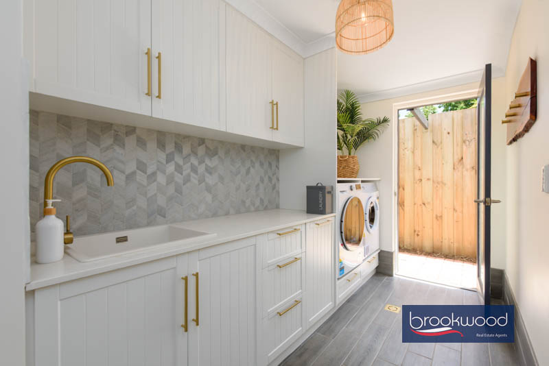 The kitchen is finished in soft mushroom cabinetry with Caesarstone benchtops that echo this neutral tone. Appliances include a new steam oven, an electric cooktop and a dishwasher. A bay window frames views to the outdoor entertaining area, accessible through double doors that open to an alfresco zone, spa and a timber-decked gazebo around a central lawn.