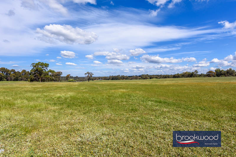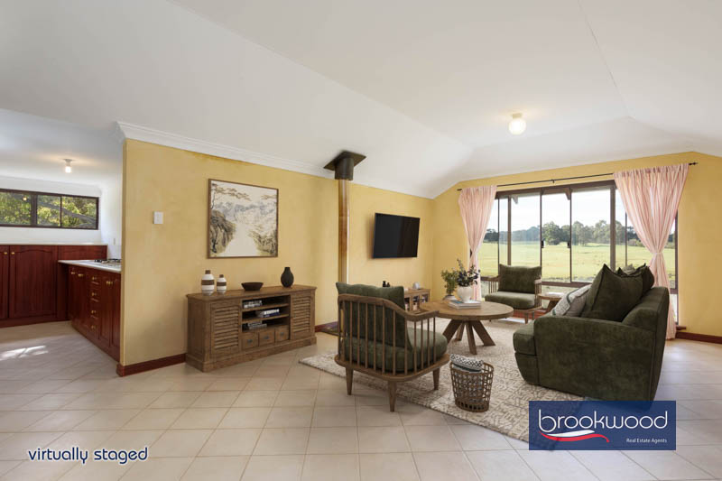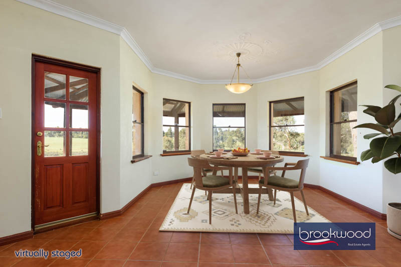 The home’s footprint spans two levels, with the ground floor designed for the needs of daily living. A deep verandah wraps three sides in shade, creating multiple places to sit, eat or watch the weather move across the valley. Inside, jarrah floors lie in a wide foyer adjacent a tiled study and pantry storeroom opening to a U-Shaped kitchen, where timber cabinets frame an electric wall oven and gas cooktop. A wide arch connects the kitchen to the dining room, its bay window composed to hold the northern view – paddocks sweeping down to water, the creek line marked by a ribbon of green, sheds silhouetted against the ridgeline. A family room anchored by a slow combustion fire connects to the dining area, with sliding glass doors dissolving the boundary between interior and verandah.